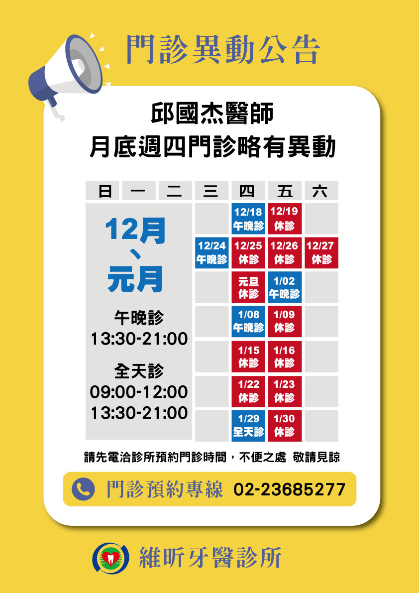 因醫師1/14-25出國,邱國杰醫師元月份門診略有異動如下 115年 # 1/01(四) 元旦 門診休診一日 # 1/02(五) 午晚門診 13:30-21:00 # 1/08(四)午晚門診 13:30-21:00 # 1/29(四)早午晚 全天門診 09:00-12:00 / 13:30-21:00
